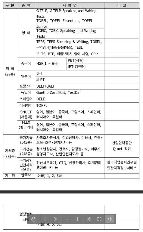 : 각종 어학시험, 국가기술(전문)자격시험, 국각공인민간자격시험등
