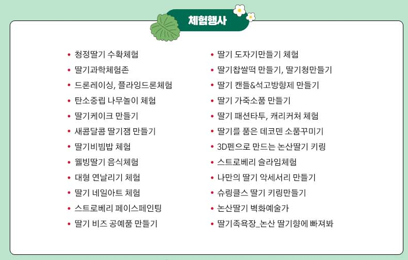 - 딸기수확체험 : 방문객들이 직접 딸기를 수확해 볼 수 있는 체험 프로그램